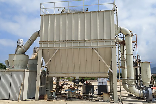 大塊物料經(jīng)破碎機破碎到所需粒度(30mm)后,由提升機將物料送至儲料斗,再由皮帶機將物料均勻定量連續(xù)地送入主機磨室磨粉機內(nèi)進行研磨。粉磨后的物料被風機氣流送入選粉機進行分級。在選粉機葉輪的作用下,不符合細度要求的物料落入磨室內(nèi)重新碾磨;合格的物料則經(jīng)空氣斜槽進入旋風集粉器內(nèi),進行分離收集,經(jīng)排料裝置排出即為成品粉體。整個過程屬于閉路循環(huán)系統(tǒng),并在正負壓狀態(tài)下運行,配備以脈沖除塵器,保證了生產(chǎn)現(xiàn)場的干凈、整潔。